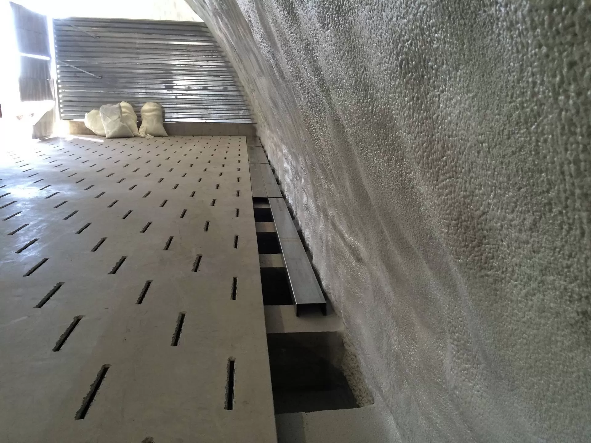 Кроме того, классическое хранение навалом со встроенными каналами становится все более совершенным. Так называемые аэрополы являются современной модификацией технологии с заглубленными воздухораспределителями. В этом случае укладку продуктов насыпью/навалом выполняют на бетонные щелевые полы. Конструкция состоит из широких бетонных траншей по всей площади помещения и общей плиты со щелями для аэрации. Насыпь формируется по напольной поверхности без каких-либо ограничений.